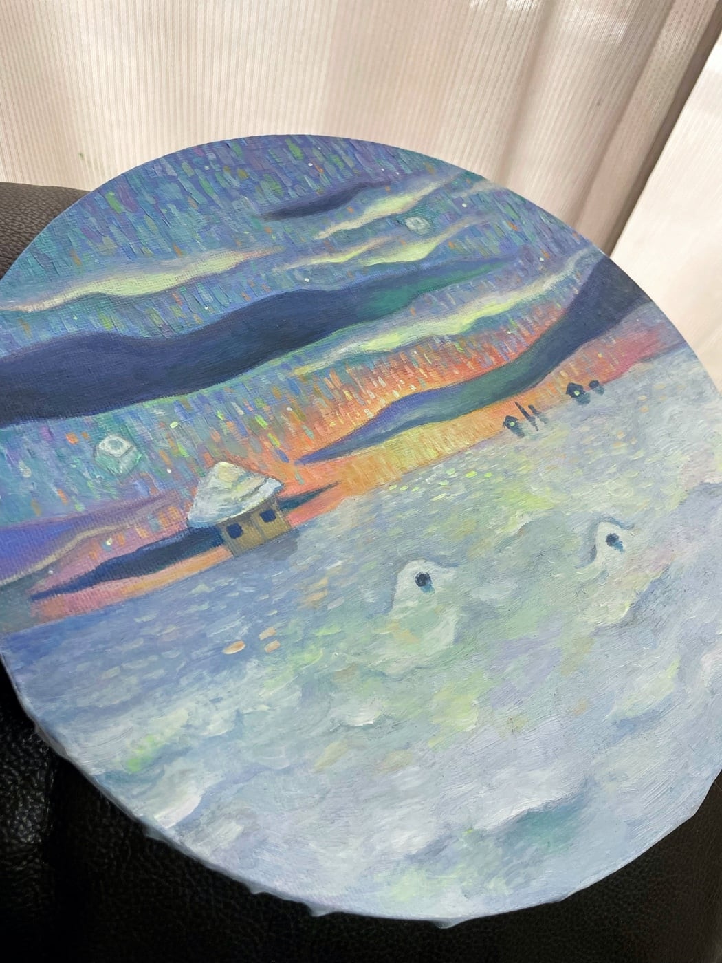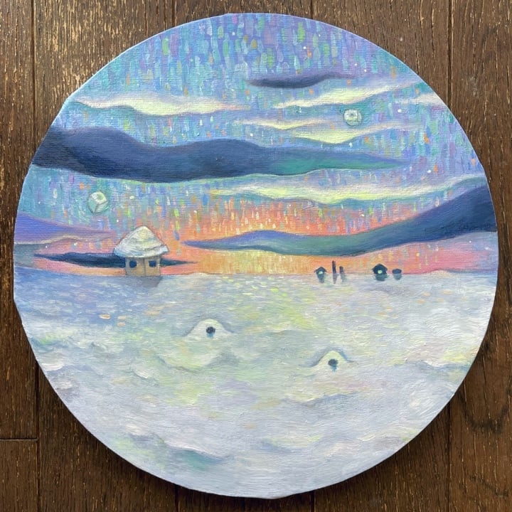 ・油彩キャンバス木枠/直径25cm/背面に壁掛け用紐あり。側面に着彩あり。サインあり。